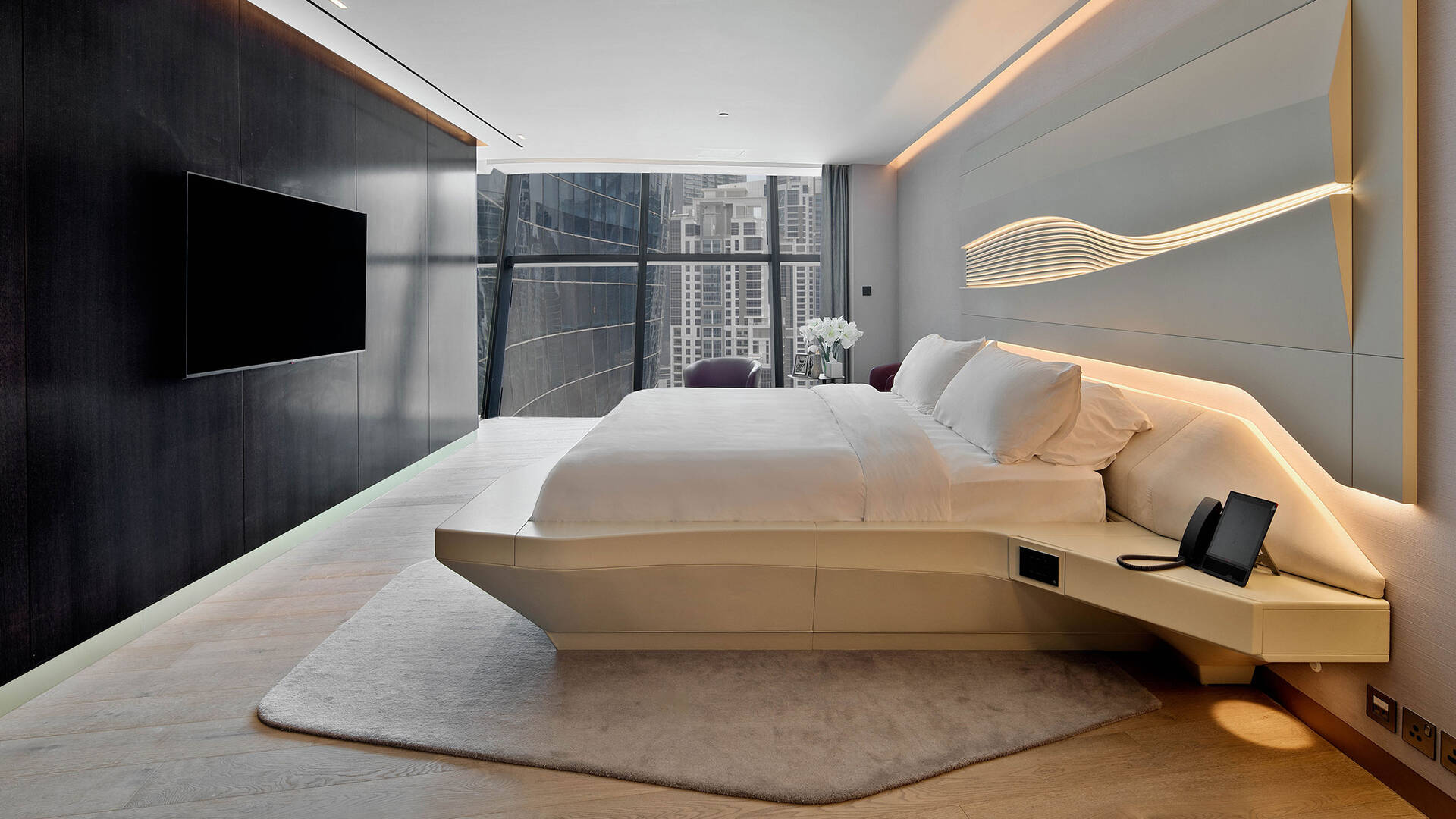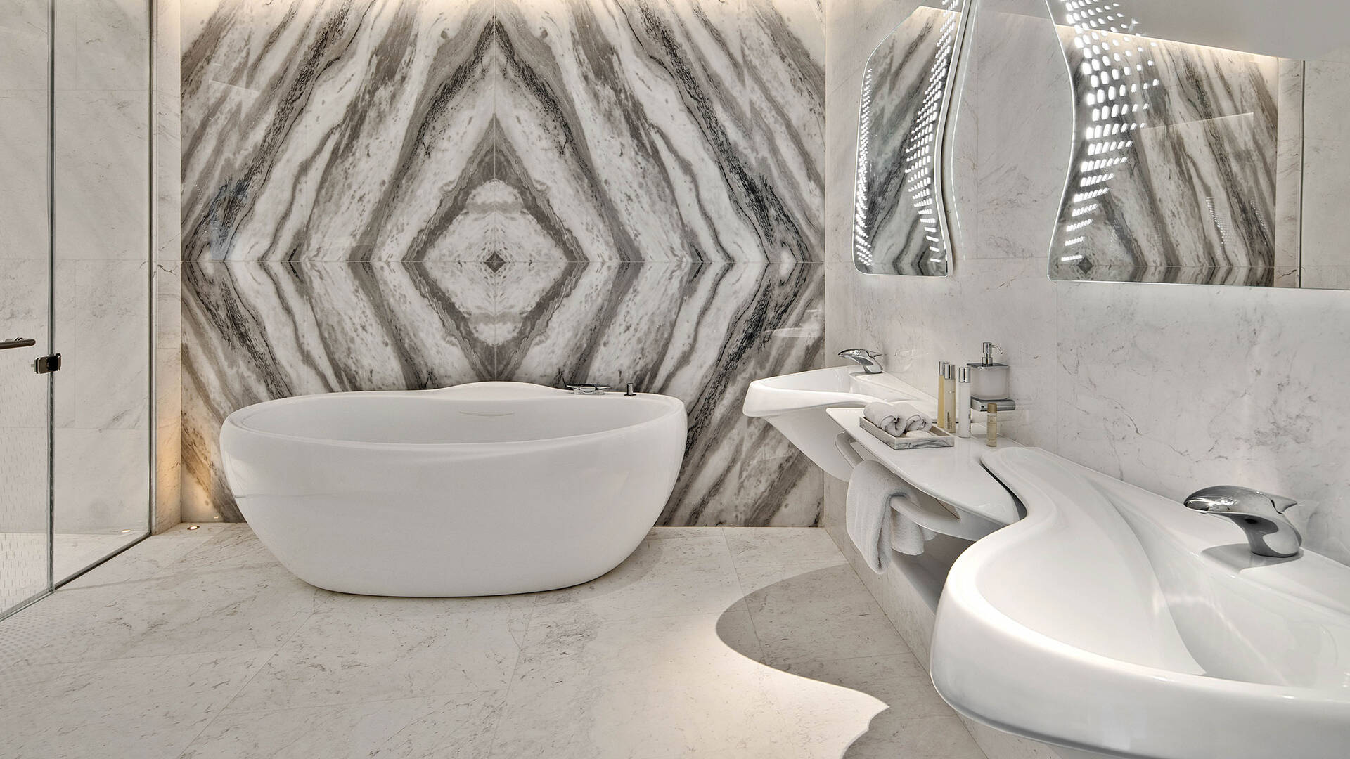 The Opus is a trophy property, the only building in the world with both interior and exterior designed by Zaha Hadid Architects. The project features tailored furnishings, sanitary ware, and lighting, with unique elements that cannot be found anywhere else in the world.