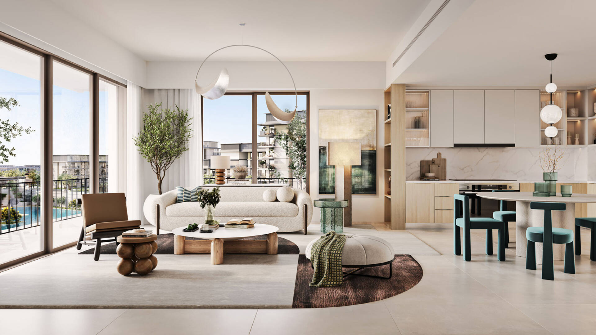 Apartment layouts feature balconies accessible from 2-3 rooms, master bedrooms with spacious wardrobes and baths, and laundry rooms. Townhouses have maid's rooms, terraces, balconies, and laundry areas, with views of the pool, sea, and Dubai skyline.
