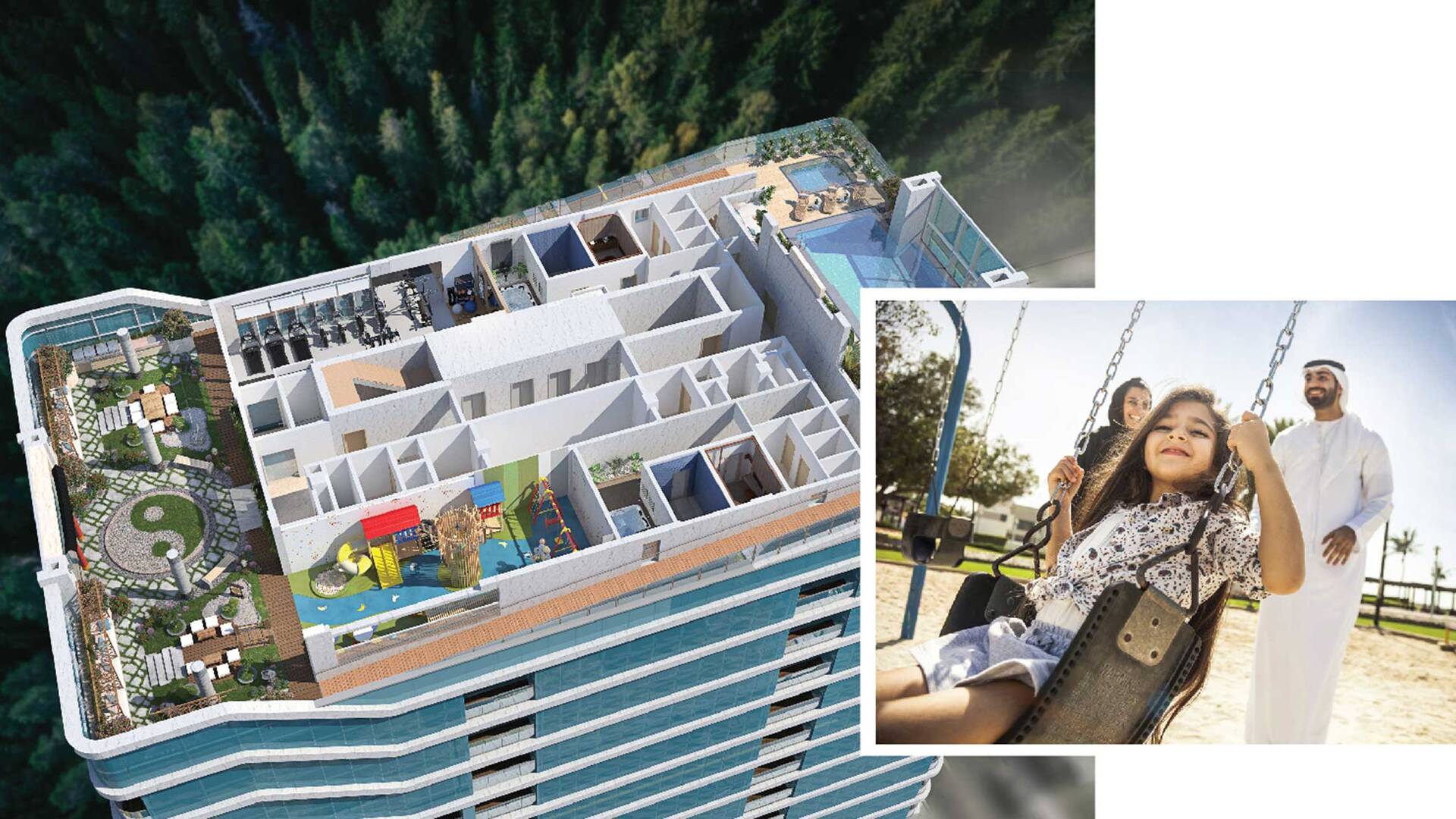 Единственный жилой проект в Дубае, при строительстве которого применены знания васту. Бассейн и ландшафтный сад на крыше, развитая инфраструктура для семей с детьми, квартиры с бассейнами на террасах и фитодизайном — часть особенностей комплекса. По данным Property Finder на июль 2023 года, стоимость годовой аренды квартир с 1–3 спальнями в районе составляет от $11434 до $31 309.
