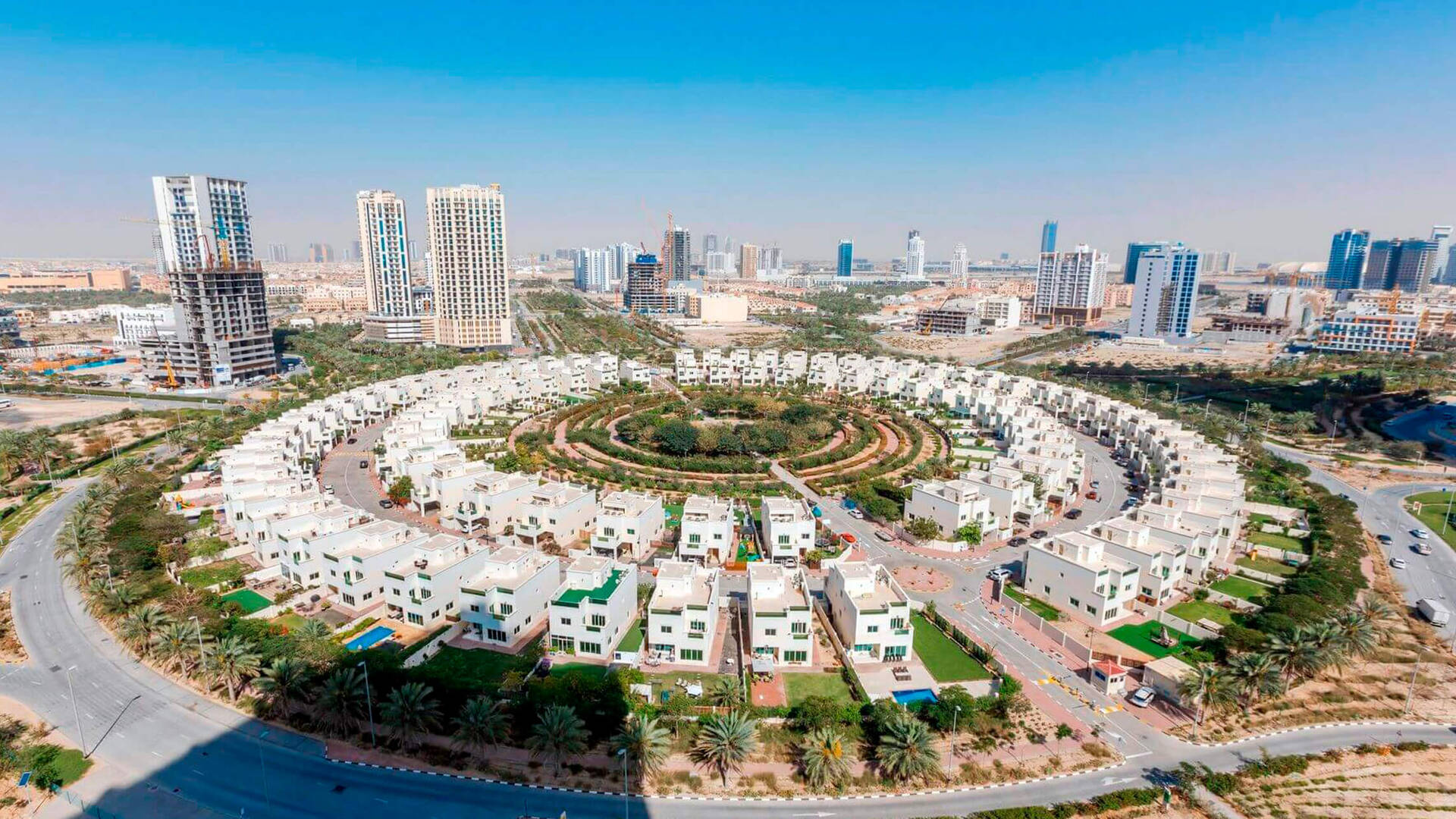 Главенствующим типом застройки среди них являются виллы и таунхаусы, выполненные в духе средиземноморской и арабской архитектуры, но есть также и ряд высотных жилых зданий с просторными студиями и апартаментами премиум-класса. Кроме того, район также включает в себя офисы, отели и объекты торгово-развлекательного характера.