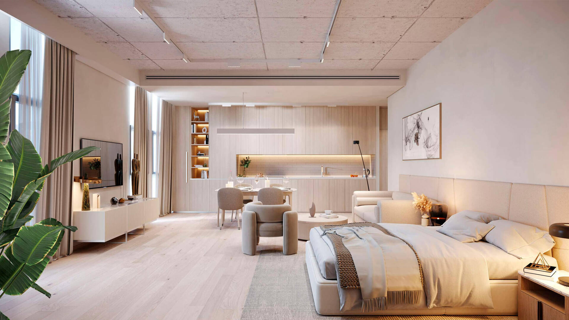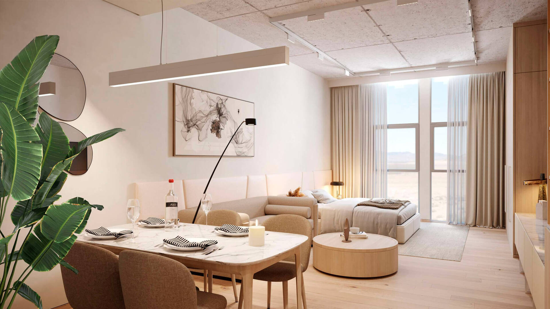 Первое что вы увидите в комплексе — стильное лобби с потолками высотой 7 метров. На этажах выше вас ждут квартиры, в которых продумана каждая деталь. Все мастер-спальни спланированы с ванными и гардеробными комнатами. Даже студии выполнены с прачечными. В стоимость апартаментов входят вся мебель, кухонный гарнитур, бытовая техника Bosch, сантехника, телевизор, вся посуда и парковочное место.
